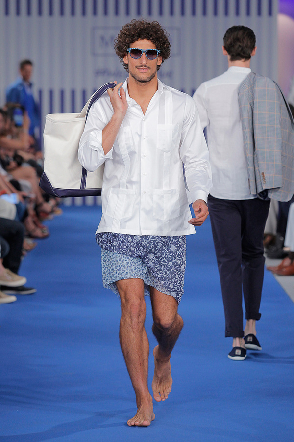 La casa líder en saber hacer artesano, Mirto, presentaba su nueva colección bajo el nombre de We Love Blue. Un cielo azul cubría toda la pasarela con sus cientos de leds que se encontraban en la bóveda del NH Collection Eurobuilding, haciendo que nos trasportásemos a unas vacaciones junto al mar. El azul era indiscutiblemente el protagonista del desfile, para distintos momentos del día, con numerosas versiones de tonos y coloraciones, versatilizando las prendas. Las mañanas de verano en el mar o el cielo de la ciudad se vestirían con prendas teñidas de azul claro, sin embargo, las tardes o noches estivales se colorearían del azul mas oscuro. Mirto apuesta por una colección en las variantes cromáticas del color azul como dominante, aunque no como color único. La prenda icónica de la firma, la camisa, elaboraba en fino algodón, se presentaba con estampados florales, diseños geométricos, y sobre bases coloreadas en azul. Las americanas de algodón con rayas de regata, eran perfectas para un look resort. Los trajes en mezclas ligeras de algodón, lana fresca y lino, se inspiraban en tonalidades añil, con diseños de cuadros de ventana. Los pantalones y las chaquetas se construían sobre bases de apariencia denim enriquecido y algodón. El blanco también se vuelve tendencia, en guayamisas (guayabera+camisa reinventada) y camisas de fiesta Por último, aparece la inspiración náutica, en parkas ligeras y windbreakes (cortavientos) que son los mejores aliados para la vida urbana. Tirantes, cinturones y fulares, bañados en tonos índigos, eran algunos de los accesorios que acompañaban a la colección. Y para los momentos de relax, pijamas, batas y prendas homewear con rayas anchas y estampados en tonalidades azules. Una colección que reinterpreta la modalidad de los estilos clásicos.